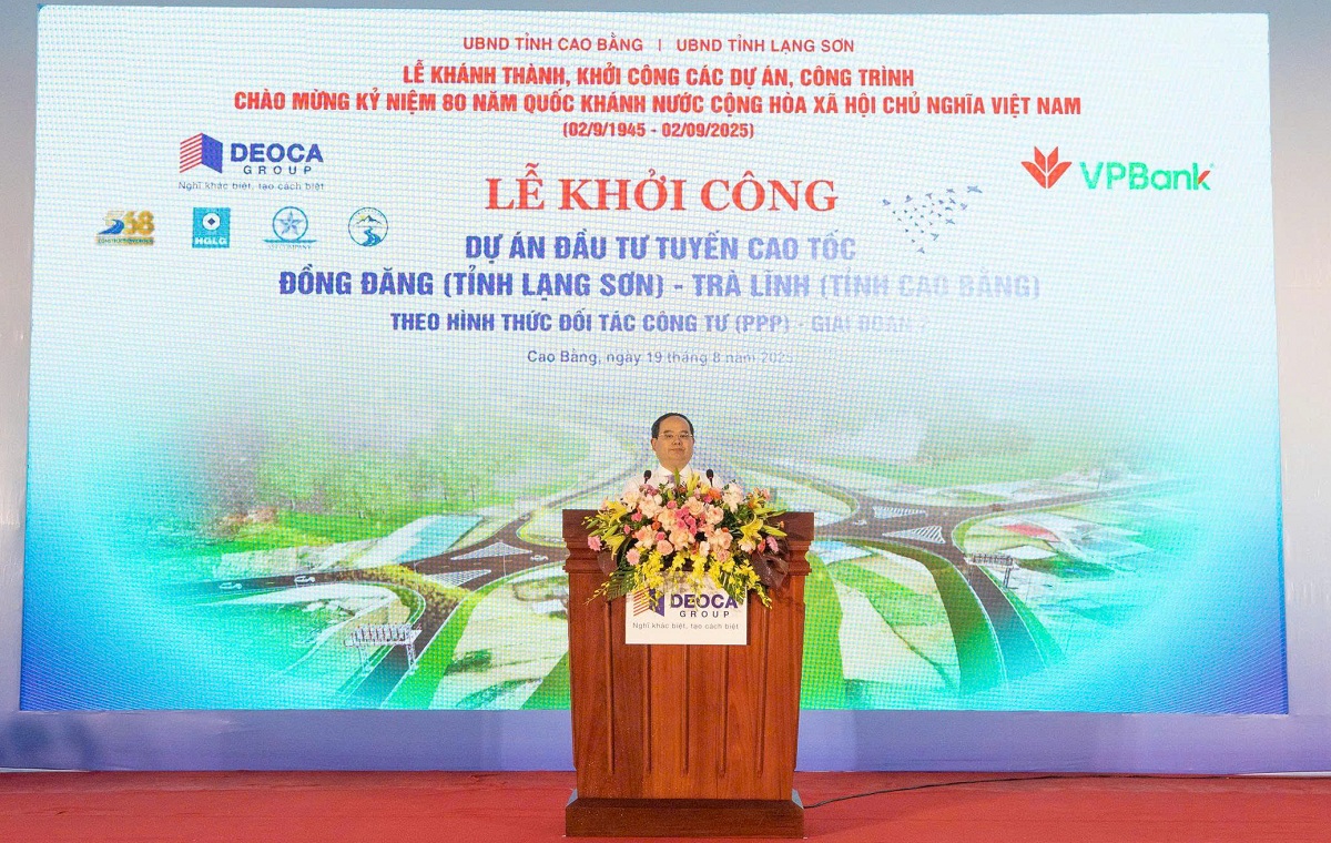 Phát biểu tại lễ khởi công , ông Hồ Minh Hoàng - Chủ tịch HĐQT Tập đoàn Đèo Cả cho biết, dự án cao tốc Đồng Đăng - Trà Lĩnh giai đoạn 1 theo kế hoạch sẽ hoàn thành vào tháng 12/2026. Nhưng thực hiện chỉ đạo của Thủ tướng về mục tiêu thông tuyến cao tốc từ Cao Bằng đến Cà Mau trong năm 2025, nhà đầu tư đồng thời là tổng thầu thi công đã điều chỉnh kế hoạch, tập trung mọi nguồn lực để rút ngắn gần 10 tháng tiến độ trong điều kiện địa hình - địa chất phức tạp bậc nhất, thời tiết không thuận lợi đặc biệt trong 3 tháng mưa vừa qua.