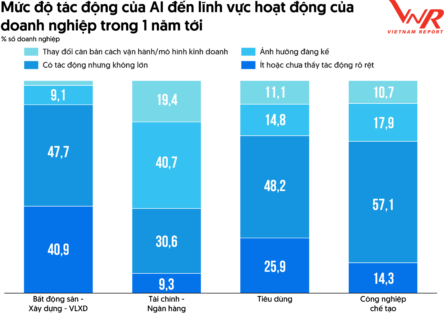 Bất động sản & Xây dựng: Tác động của AI còn hạn chế (40,9% doanh nghiệp đánh giá chưa rõ rệt) do đặc thù dữ liệu phân tán và chưa chuẩn hóa.