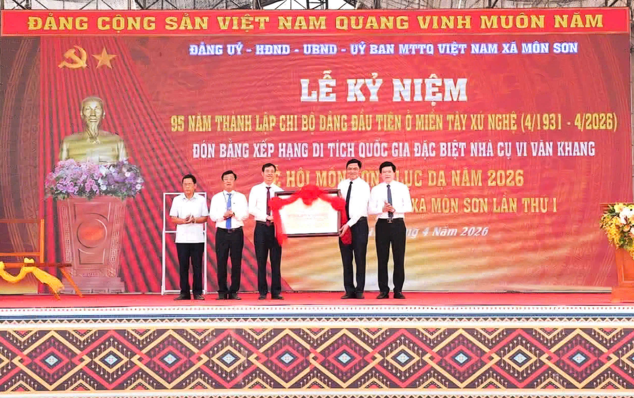 (THPL) - Ngày 12/4, xã Môn Sơn tổ chức Lễ kỷ niệm 95 năm thành lập Chi bộ Đảng đầu tiên ở miền Tây xứ Nghệ (4/1931 - 4/2026), đón nhận Bằng xếp hạng Di tích lịch sử quốc gia đặc biệt Nhà cụ Vi Văn Khang, khai mạc Đại hội Thể dục thể thao lần thứ I và Lễ hội Môn Sơn - Lục Dạ năm 2026.