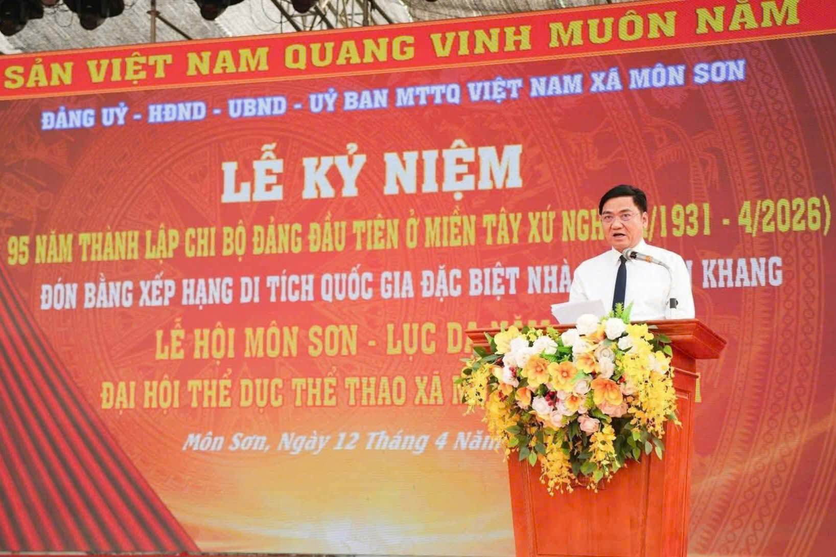 Phát biểu tại buổi lễ, ông Hoàng Nghĩa Hiếu phó bí thư thường trực tỉnh ủy, chủ tịch hội đồng nhân dân tỉnh Nghệ An ghi nhận và biểu dương những thành tựu nổi bật mà Đảng bộ, chính quyền và nhân dân các dân tộc xã Môn Sơn đã đạt được trong suốt chặng đường 95 năm qua. Đây là niềm tự hào to lớn, là minh chứng cho truyền thống cách mạng kiên cường của vùng đất Môn Sơn anh hùng; đồng thời đề nghị địa phương tiếp tục phát huy truyền thống đoàn kết, giữ gìn và phát huy giá trị di tích lịch sử, bản sắc văn hóa dân tộc, gắn với phát triển du lịch cộng đồng, từng bước nâng cao đời sống vật chất và tinh thần cho Nhân dân.