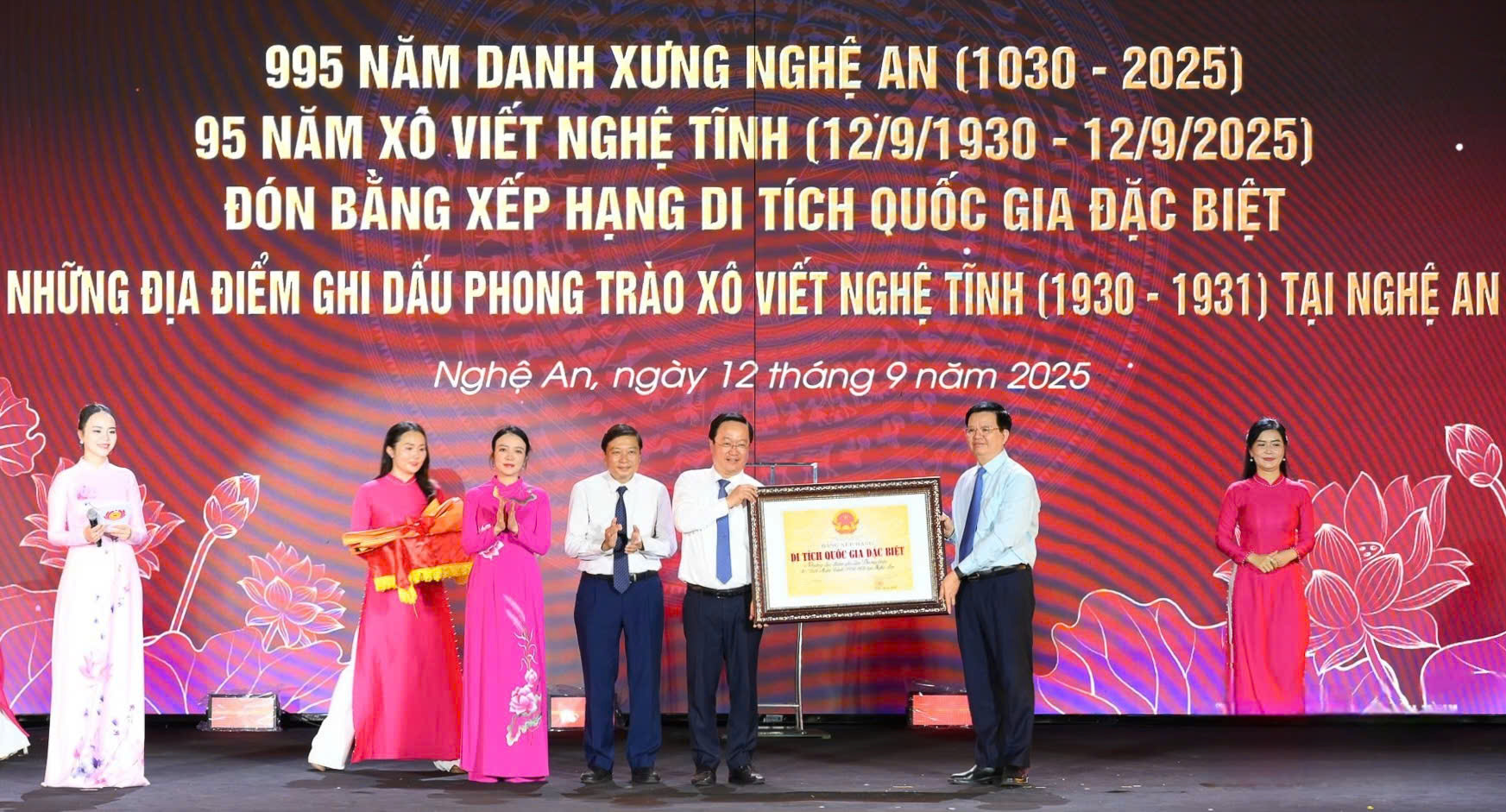 (THPL)- Tối 12/9, tại Bảo tàng Nghệ An - Xô viết Nghệ Tĩnh, tỉnh Nghệ An trọng thể tổ chức lễ kỷ niệm 995 năm danh xưng Nghệ An (1030 - 2025), 95 năm Xô viết Nghệ Tĩnh (12/9/1930 - 12/9/2025), đón Bằng xếp hạng di tích quốc gia đặc biệt “Những địa điểm ghi dấu Phong trào Xô Viết Nghệ Tĩnh (1930-1931) tại Nghệ An" và ra mắt show trải nghiệm đêm “Lửa Xô Viết”.