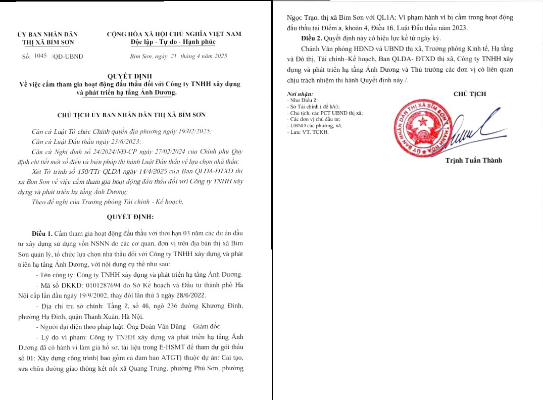 UBND thị xã Bỉm Sơn (tỉnh Thanh Hóa), vừa ban hành quyết định cấm tham gia hoạt động đấu thầu 3 năm đối với Công ty TNHH Xây dựng và phát triển hạ tầng Ánh Dương (mã số ĐKKD: 0101287694; trụ sở chính: Tầng 2, số 46, ngõ 236 đường Khương Đình, phường Hạ Đình, quận Thanh Xuân, Hà Nội), vì làm giả hồ sơ, tài liệu trong HSDT, vi phạm hành vi bị cấm trong đấu thầu, nêu tại điểm a khoản 4 Điều 16 Luật Đấu thầu 2023.