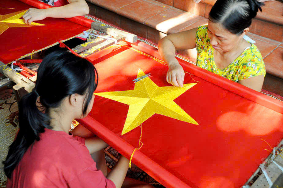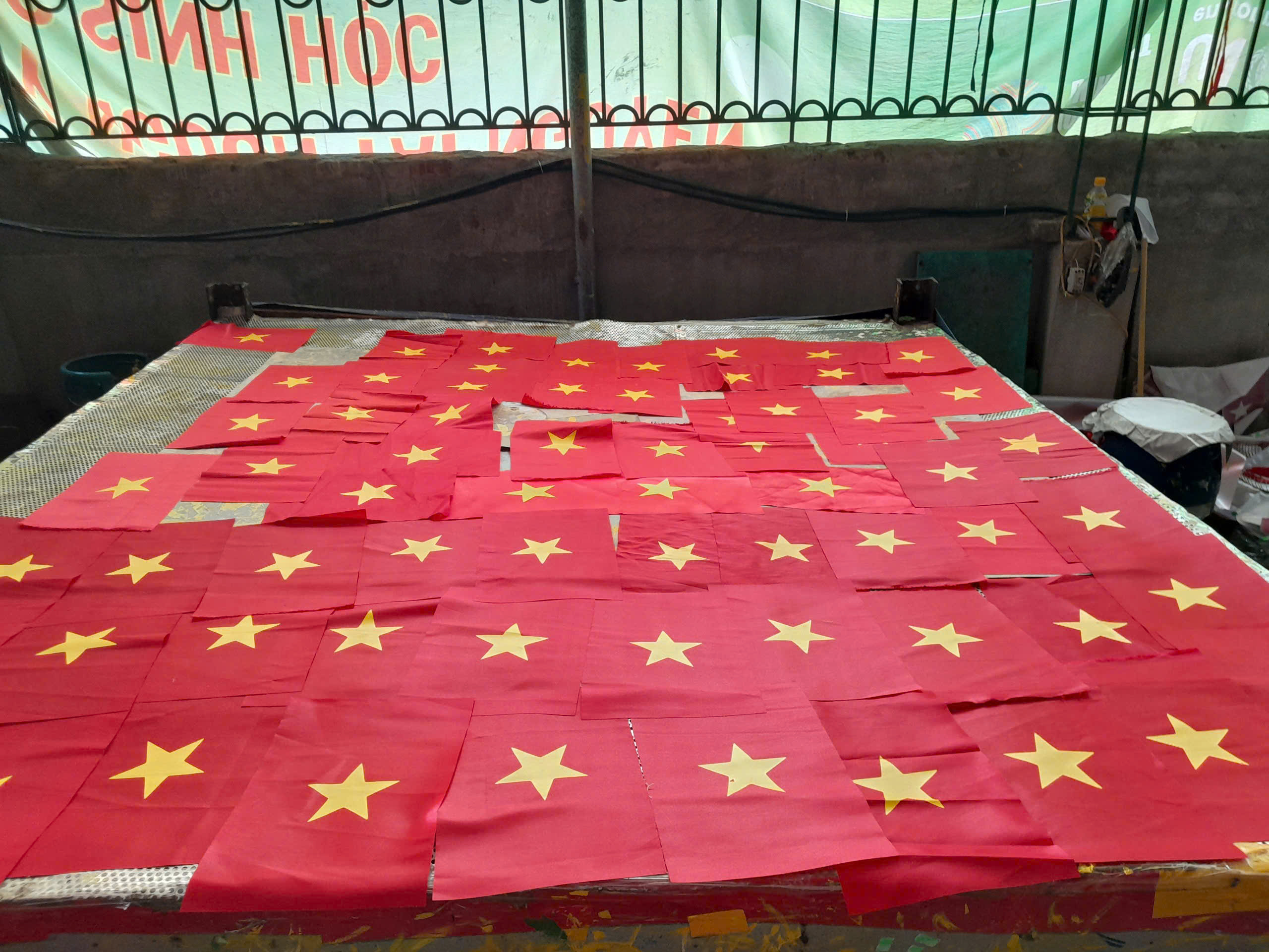 Để làm ra một lá cờ Tổ quốc đạt chuẩn, người nghệ nhân phải trải qua khoảng mười công đoạn tỉ mỉ. Trước hết là chọn vải, phải là loại vải bóng, dai, không nhăn, có sắc đỏ tươi rực rỡ. Tiếp theo là đo đạc, vẽ khung ngôi sao vàng theo đúng quy chuẩn tỷ lệ. Công đoạn khó nhất chính là xác định vị trí ngôi sao, nếu chỉ lệch đi một vài milimet, cả lá cờ sẽ mất cân đối và không đạt yêu cầu. Sau đó, nghệ nhân mới bắt đầu thêu hoặc may ngôi sao, với những mũi chỉ nhỏ, đều, khéo léo để ngôi sao nổi bật trên nền đỏ.