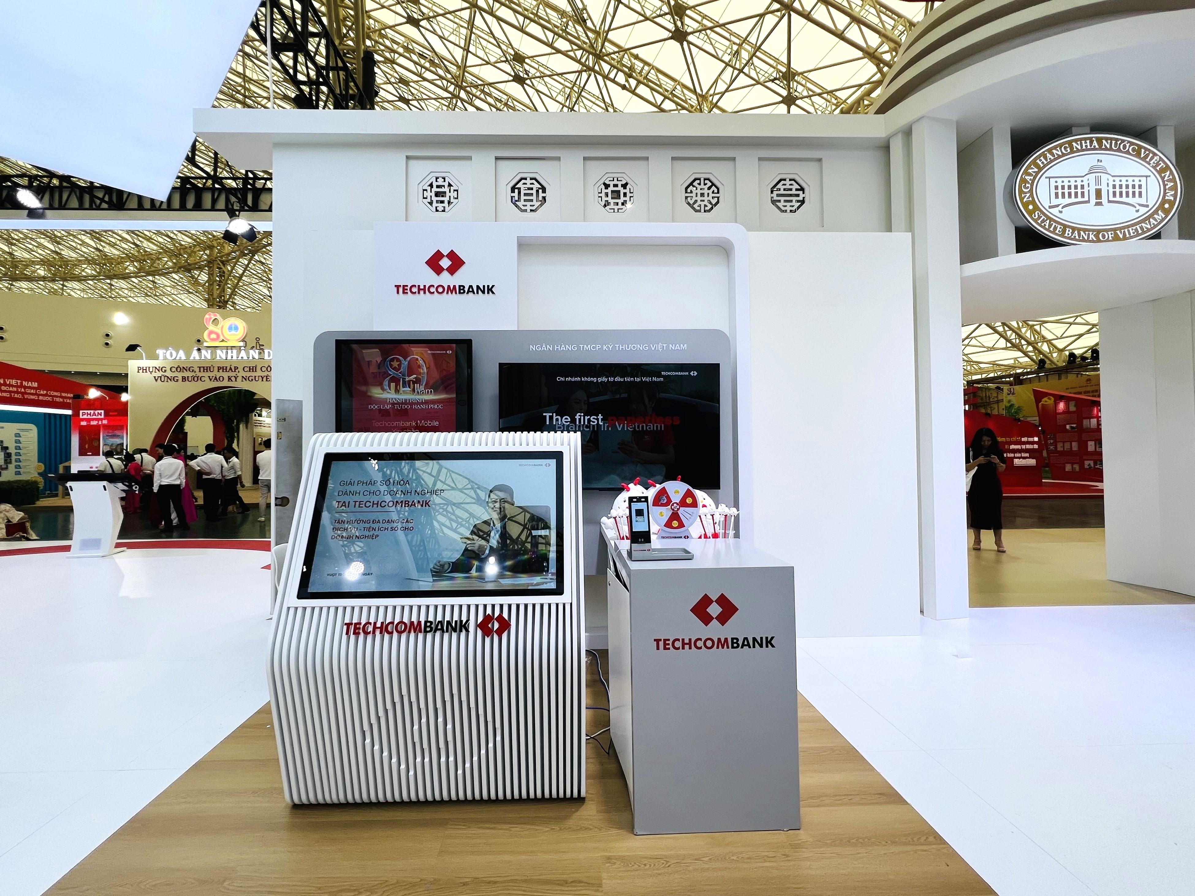 Tại không gian trưng bày của Techcombank, khách tham quan sẽ có cơ hội nhận được nhiều phần quà đặc sắc, đồng thời khám phá các giải pháp tài chính số tiên phong như ứng dụng Techcombank Mobile với tính năng mở tài khoản online, Techcombank Sinh Lời Tự Động, bảo hiểm số, vay tín chấp, hay nền tảng Techcombank Business dành cho doanh nghiệp với các giải pháp thanh toán, vay vốn và vận hành số hóa. Gian hàng cũng giới thiệu mô hình chi nhánh không giấy tờ và năng lực ứng dụng dữ liệu, AI, khẳng định vai trò dẫn dắt của Techcombank trong hành trình số hóa ngành tài chính.