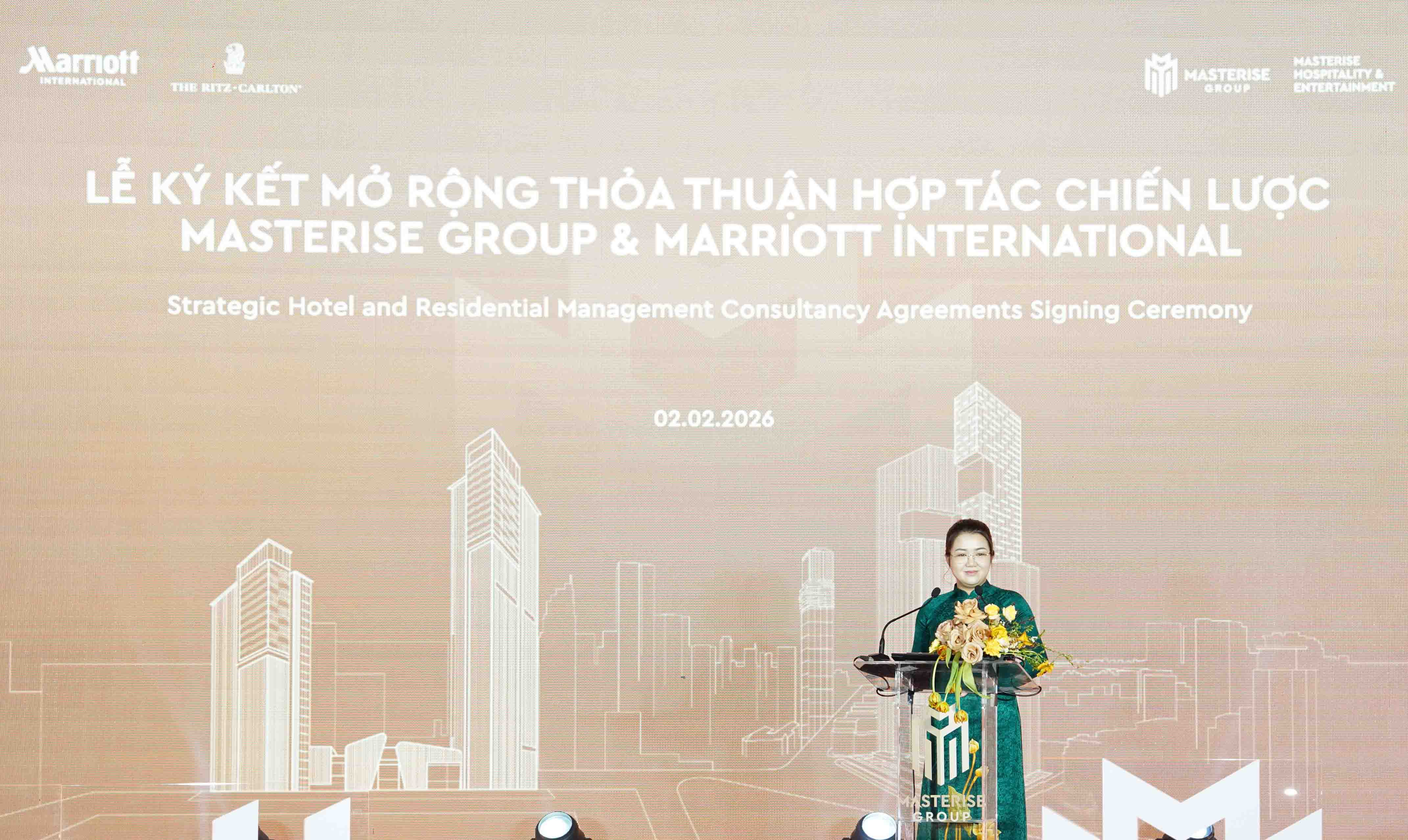 Thỏa thuận hợp tác được ký kết bởi bà Tạ Anh Phương – Giám đốc Cấp cao Khối Khách sạn & Giải trí, Masterise Group và ông Gautam Bhandari – Giám đốc Phát triển khu vực châu Á – Thái Bình Dương (không bao gồm Trung Quốc), Marriott International. Cùng với việc ra mắt Masterise Hospitality & Entertainment (MHE) vào năm 2025, thỏa thuận này đánh dấu cột mốc quan trọng trong chiến lược mở rộng của Masterise Group sang lĩnh vực khách sạn – nghỉ dưỡng, từng bước khẳng định vai trò nhà phát triển bất động sản toàn diện với năng lực triển khai các dự án quy mô lớn, phức hợp và đa chức năng theo tiêu chuẩn quốc tế.