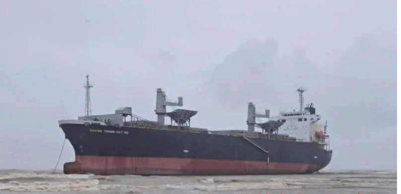 Một tàu vận tải trôi dạt trong cơn bão số 5 vào bờ biển Thanh Hóa