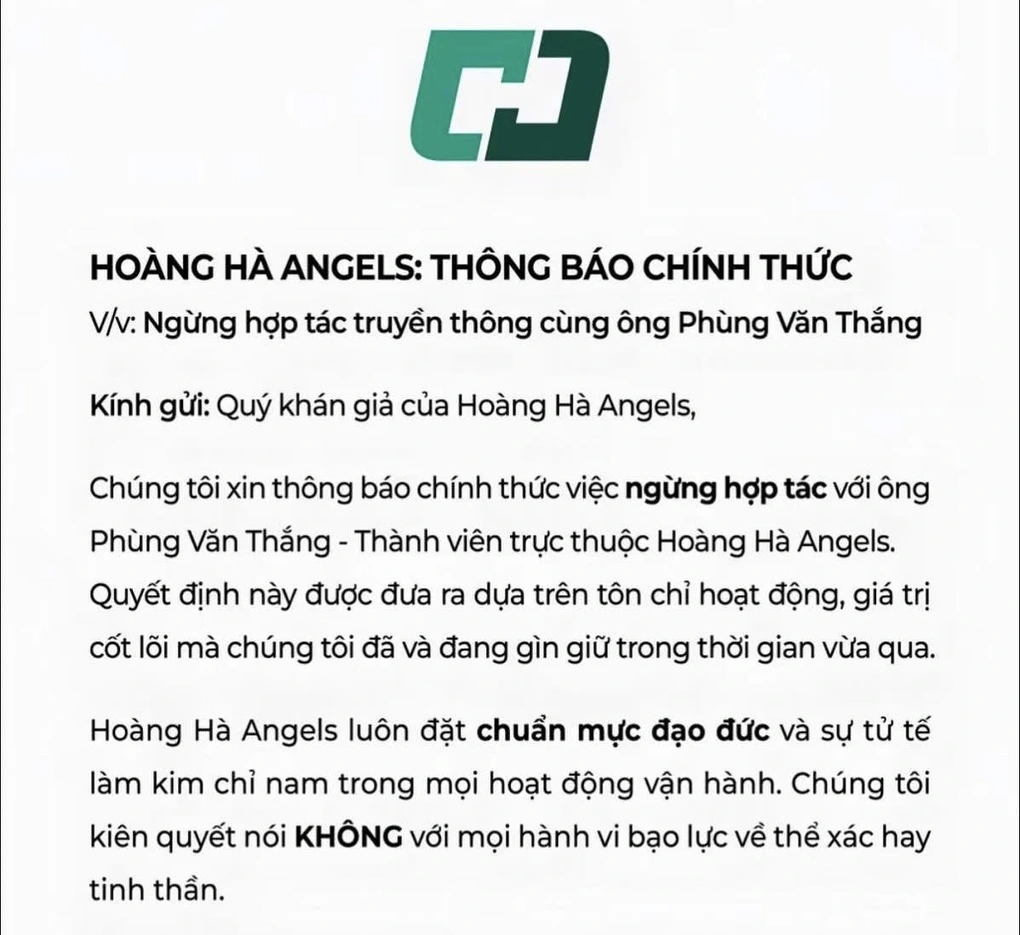 Trước áp lực từ dư luận và dựa trên tôn chỉ hoạt động, sáng ngày 24/2, Hoàng Hà Angels – đơn vị quản lý và là kênh sáng tạo nội dung của hệ thống bán lẻ Hoàng Hà Mobile – đã phát đi thông báo chính thức. Đơn vị này khẳng định chấm dứt hợp tác truyền thông với Phùng Văn Thắng.