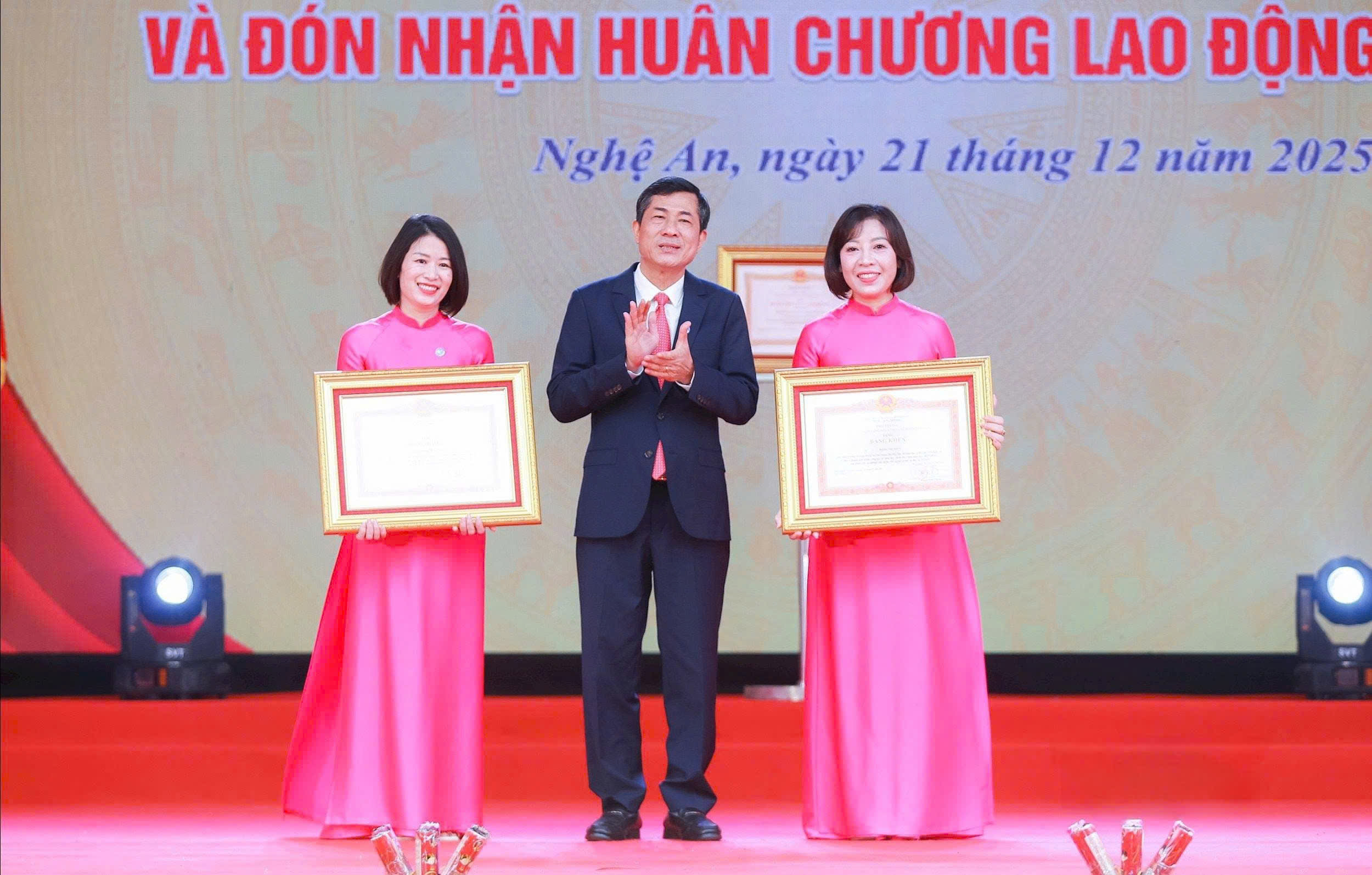 Ông Võ Trọng Hải - Phó Bí thư Tỉnh ủy, Chủ tịch UBND tỉnh Nghệ An trao Huân chương Lao động hạng Ba do Chủ tịch nước tặng thầy Cao Thanh Bảo - Hiệu trưởng và cô Lê Thị Kiều Nga - Phó Hiệu trưởng Trường THPT Hà Huy Tập.