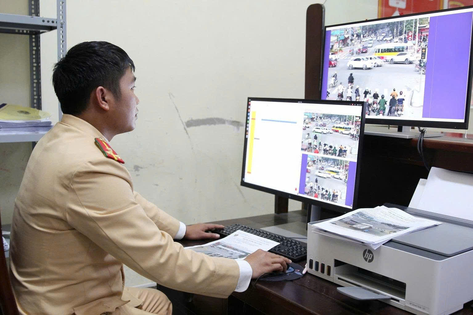 Lực lượng chức năng rà soát phương tiện vi phạm từ hình ảnh ghi nhận qua camera.