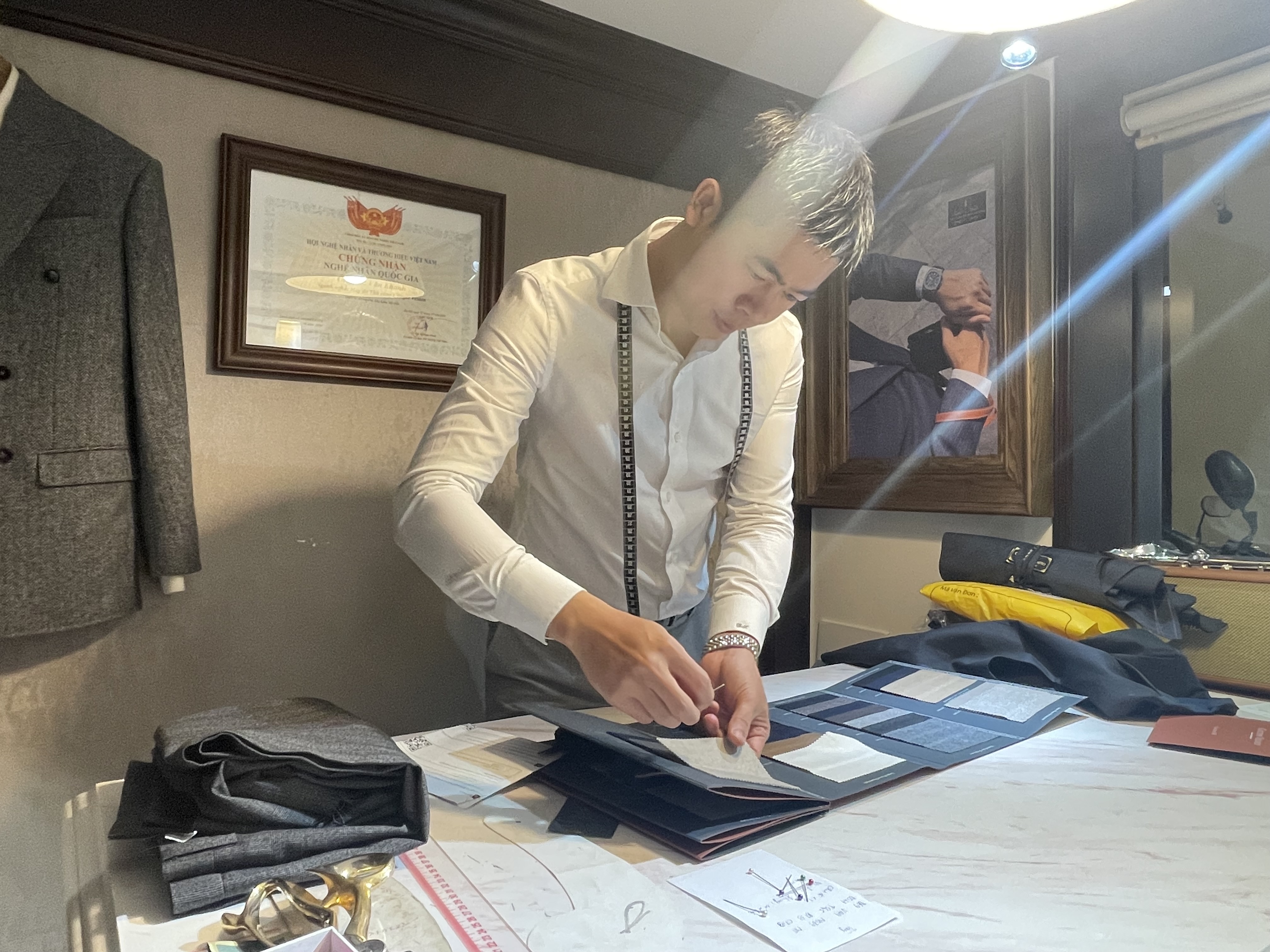Cách Bùi Khánh làm nghề cũng mang đậm chất “nghệ sĩ”. Anh chỉ thực sự sáng tạo khi đêm xuống, lúc mọi ồn ào lắng lại. Trong không gian tĩnh lặng, một mình bên cây kéo, thước phấn và những thước vải thượng hạng, anh lần giở lại từng chi tiết: từ phong thái, lối sống đến thần sắc của khách hàng, kết hợp cùng những thông số hình thể đã ghi nhớ, để phác thảo nên phom dáng phù hợp nhất - riêng nhất - và có “hồn” nhất cho từng bộ vest.