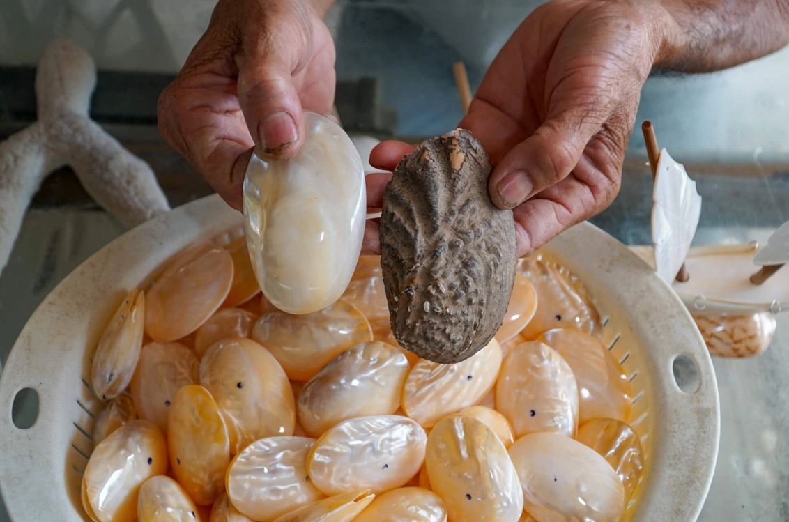 Để tạo ra một sản phẩm hoàn chỉnh, người thợ phải đi qua hàng chục bước: chọn vỏ có màu sắc phù hợp, làm sạch, ngâm khử mùi, cắt gọt, tạo hình, đánh bóng rồi phủ sơn nhiều lần. Công việc đòi hỏi sự tập trung cao độ và khả năng hình dung mẫu trong không gian.