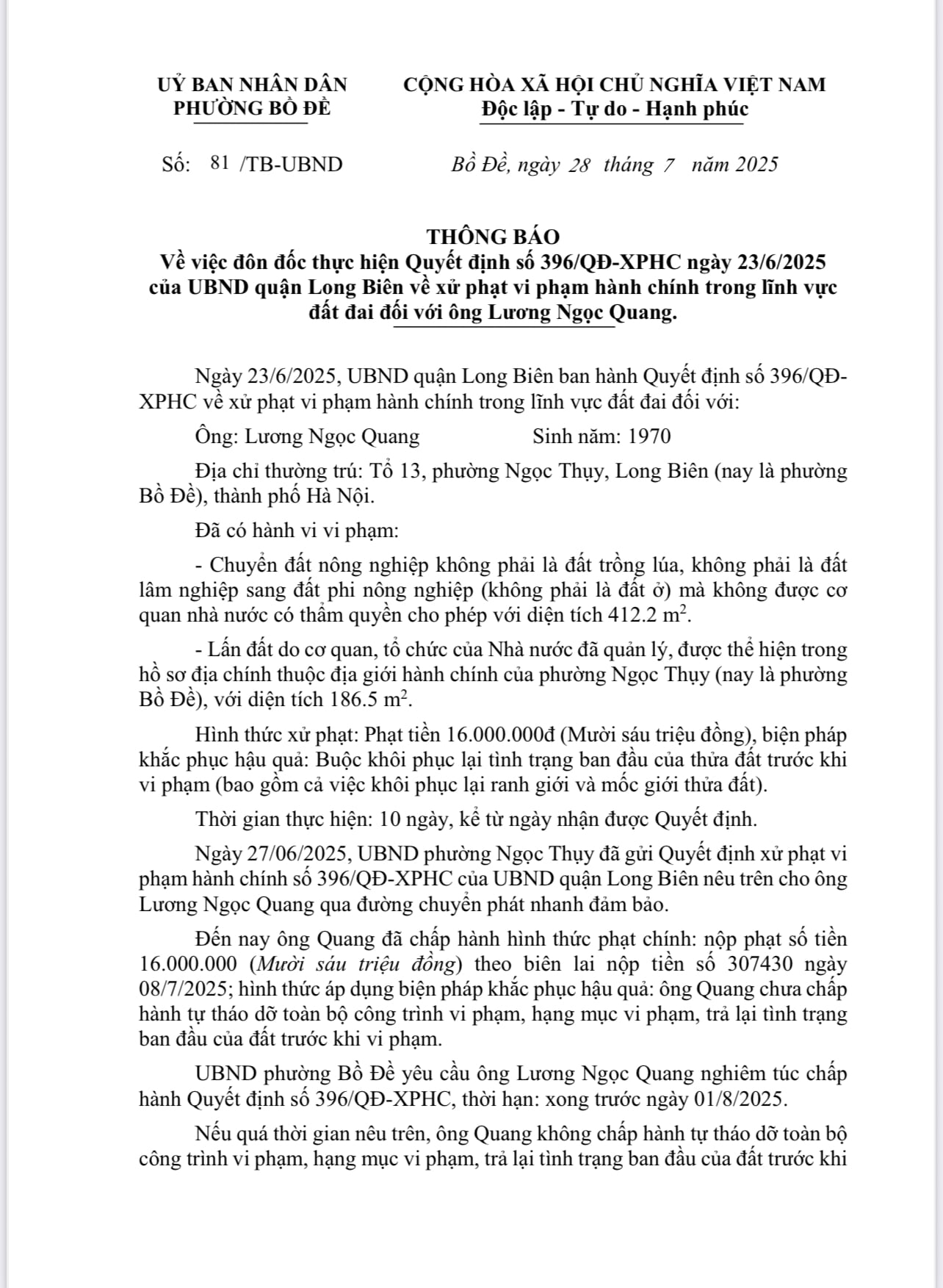 Được biết, ngày 28/7/2025, ông Phạm Bạch Đằng - Chủ tịch UBND phường Bồ Đề ra Thông báo Số 81/TB-UBND yêu cầu ông Lương Ngọc Quang nghiêm túc chấp hành Quyết định số 396/QĐ-XPHC, thời hạn: xong trước ngày 01/8/2025. Nếu quá thời gian nêu trên, ông Quang không chấp hành tự tháo dỡ toàn bộ công trình vi phạm, hạng mục vi phạm, trả lại tình trạng ban đầu của đất trước khi vi phạm, UBND phường ban hành quyết định cưỡng chế, xử lý vi phạm theo thẩm quyền.