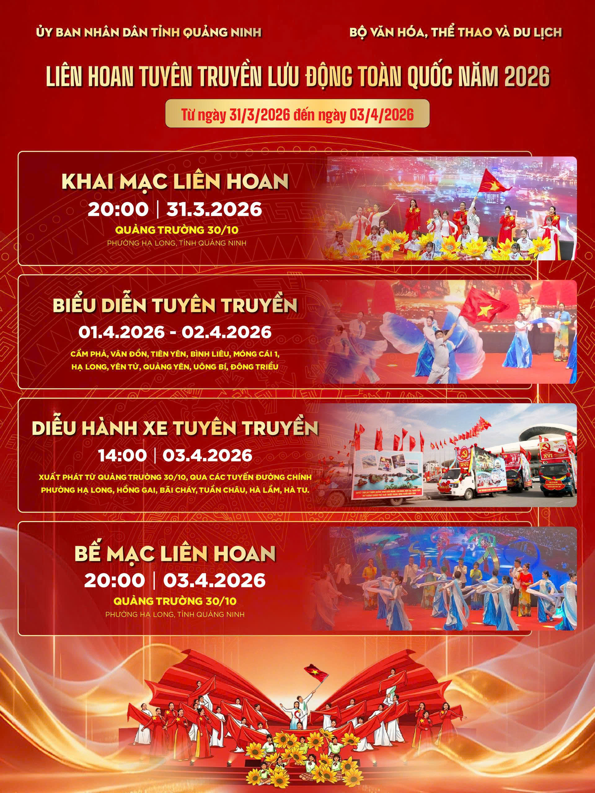 Ngày 1/4 - 2/4: Các đoàn tỏa đi thi diễn lưu động tại các địa phương: Móng Cái, Bình Liêu, Tiên Yên, đặc khu Vân Đồn, Cẩm Phả, Quảng Yên, Uông Bí, Yên Tử và Đông Triều.