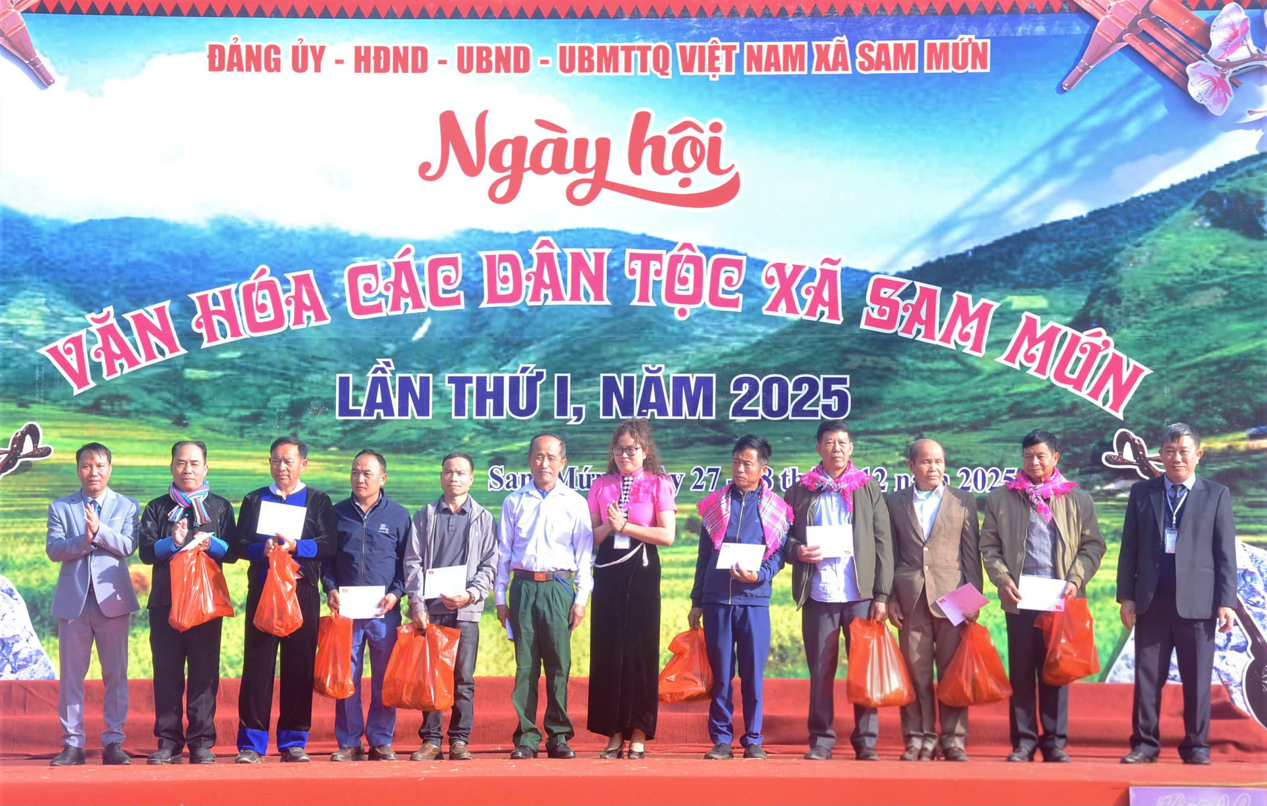 Lãnh đạo Đảng ủy, HĐND, UBND, Ủy ban Mặt trận Tổ quốc xã Sam Mứn tặng quà già làng, người có uy tín trên địa bàn tích cực tham gia xây dựng bản làng, gìn giữ văn hóa truyền thống. Ảnh: BĐB