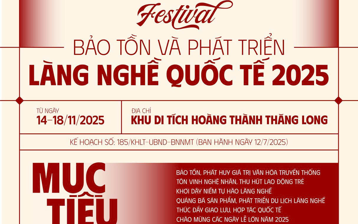 (THPL) - Festival bảo tồn và phát triển làng nghề quốc tế 2025 sẽ chính thức diễn ra từ ngày 14 đến 18/11 tại Trung tâm Di sản Hoàng thành Thăng Long - Hà Nội. Sự kiện này do Ủy ban Nhân dân thành phố Hà Nội phối hợp cùng Bộ Nông nghiệp và Môi trường tổ chức.