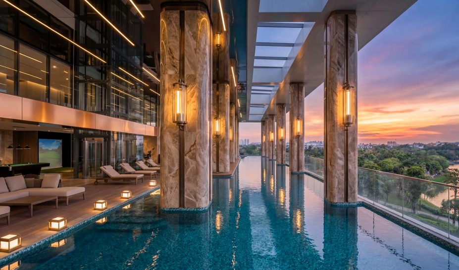 Tổ hợp bể bơi trong nhà – ngoài trời chuẩn 5 sao với diện tích hơn 3.300m² tại tầng 3, kiến tạo “ốc đảo” nghỉ dưỡng độc bản tại Noble Crystal Long Bien WorldHotels Residences.