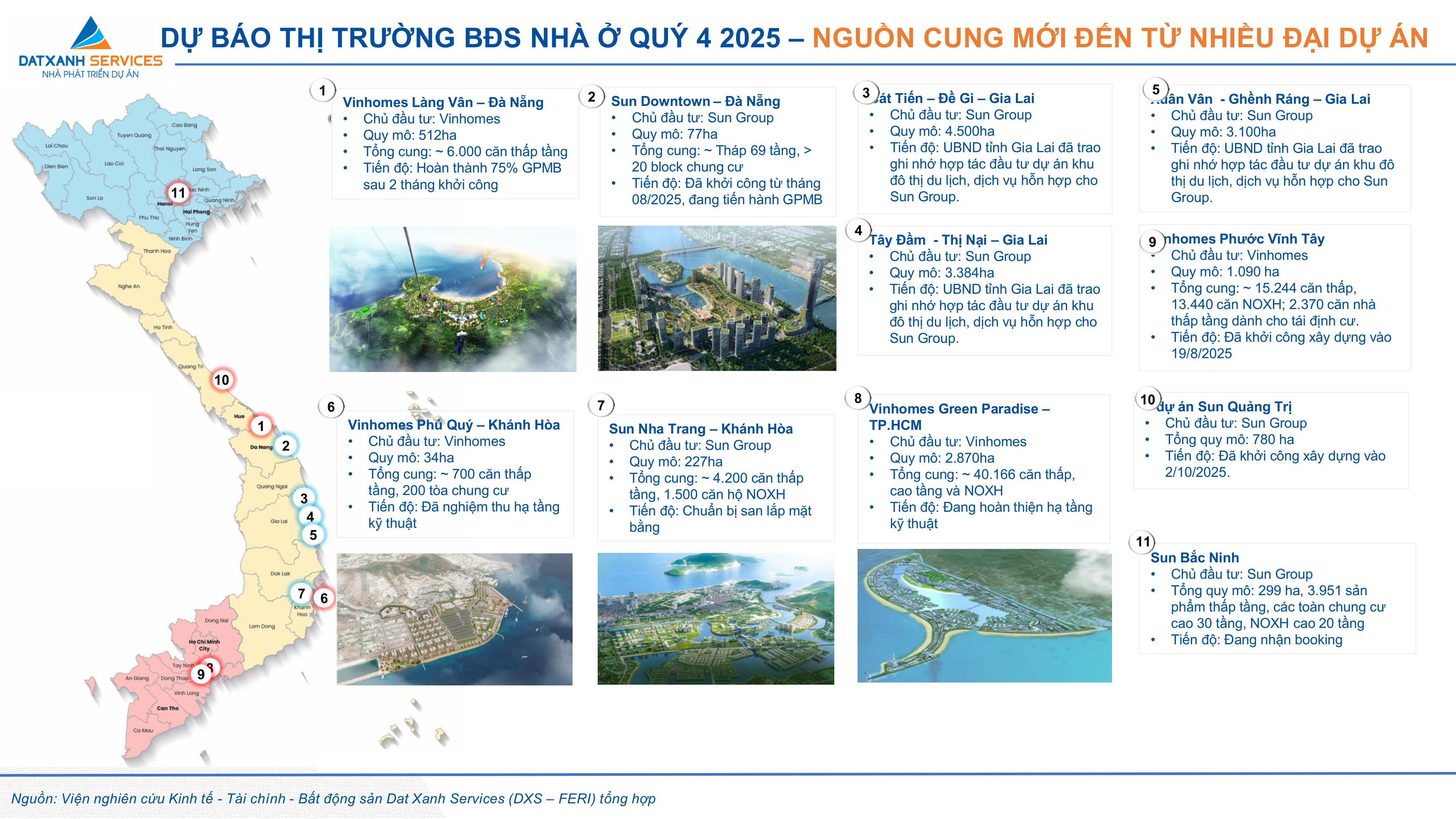Dat Xanh Services cho rằng quý IV/2025 sẽ là giai đoạn bản lề của chu kỳ mới. Trong kịch bản thuận lợi, nguồn cung có thể tăng 40–50%, giá bán tăng 10–15% và tỷ lệ hấp thụ đạt 45% nếu mặt bằng lãi suất duy trì ổn định quanh 8–9%. Ở chiều ngược lại, nếu lãi suất tăng hoặc dòng vốn bị thắt chặt, tốc độ hấp thụ có thể giảm còn 20–30%.