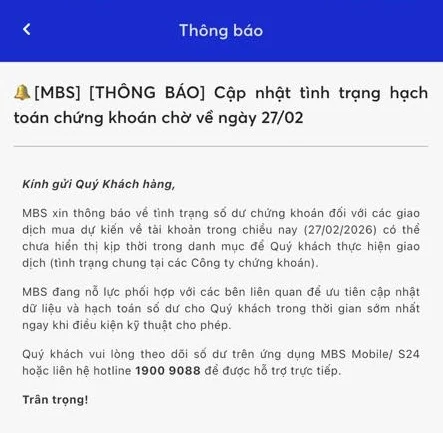 Ngay đầu phiên giao dịch chiều ngày 27/2/2026, cộng đồng nhà đầu tư xôn xao khi chứng khoán dự kiến "về tài khoản" theo chu kỳ không xuất hiện đúng như thông lệ. Hàng loạt công ty chứng khoán lớn như SSI, MBS, VPBankS, KAFI... đã đồng loạt phát đi thông báo về việc quy trình thanh toán bù trừ trên toàn thị trường bị chậm trễ.