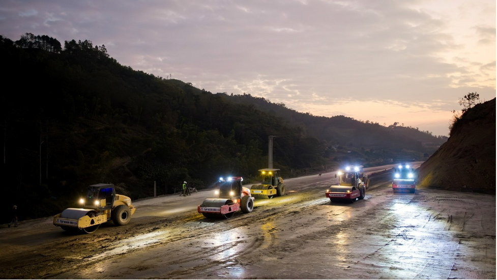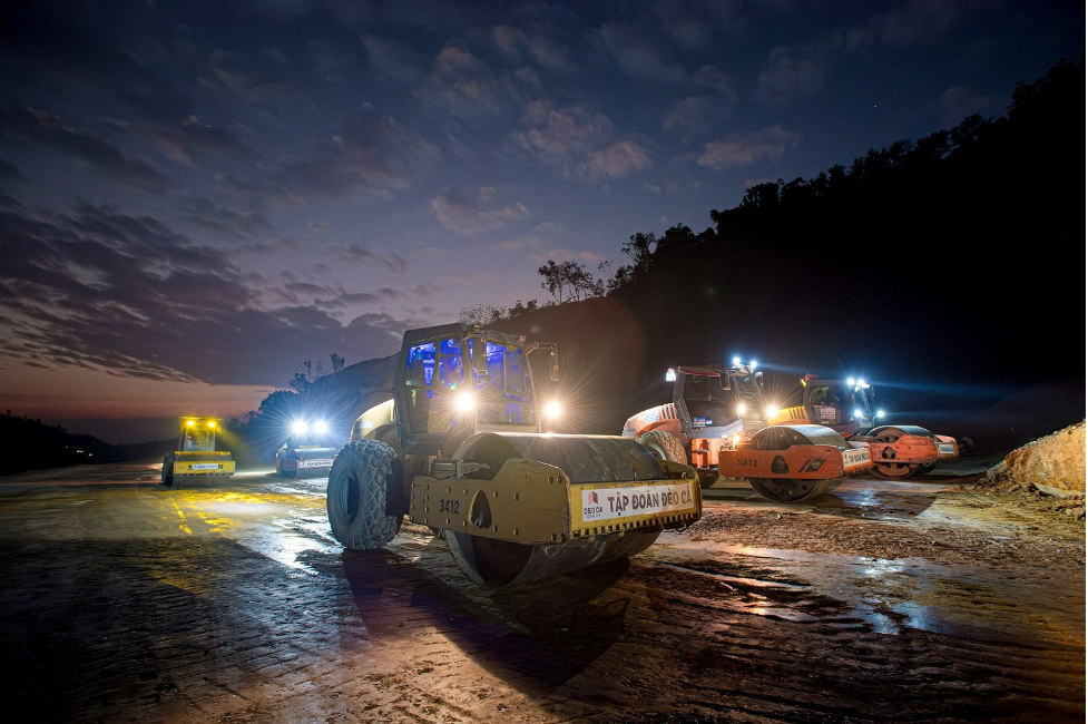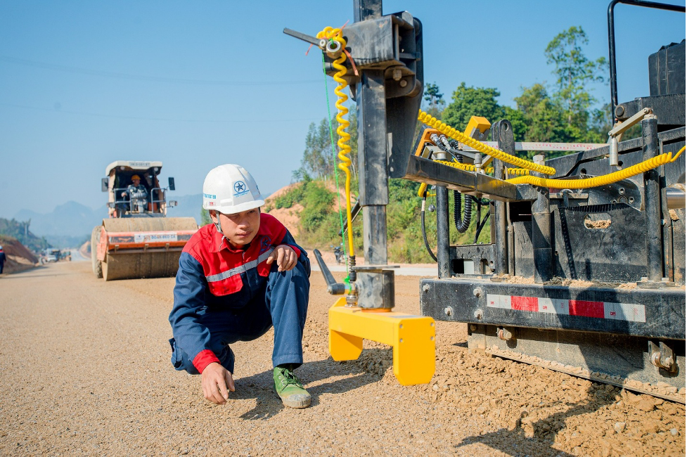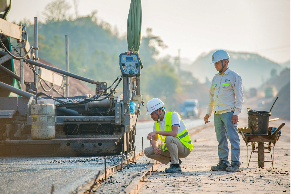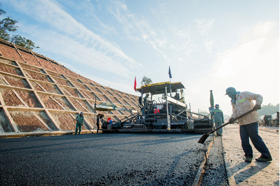 Riêng dây chuyền thảm nhựa tại phân đoạn này hiện huy động 15 thiết bị và 30 nhân công, làm việc từ 7h - 20h mỗi ngày. Trong điều kiện thời tiết thuận lợi, nhà thầu thi công huy động xe chở bê tông nhựa từ trạm trộn cùng dây chuyền thảm hiện đại và nhiều thiết bị lu lèn, tiến hành thảm bê tông nhựa mặt đường.