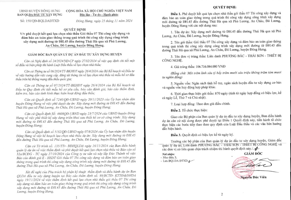 Liên danh nhà thầu Phương Bắc – Thái Sơn và Thiết bị Công Nghệ giá dự thầu sau giảm giá: 106.716. 084.273, 6038 VND (xếp thứ 2), nên được lựa chọn thương thảo để ký hợp đồng xây dựng. Ngày 25/11/2024, ông Nguyễn Đức Viên – Giám đốc Ban quản lý dự án đầu tư xây dựng huyện Đông Hưng (Ban A) đã ký quyết định số 150/ QĐ – BQLDAĐTXD “công nhận” liên danh nhà thầu Phương Bắc – Thái Sơn và Thiết bị Công Nghệ là đơn vị trúng thầu.