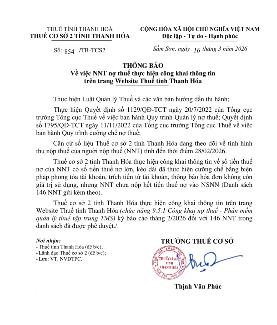 Theo đó, Thuế cơ sở 2 tỉnh Thanh Hóa đã tiến hành công khai danh sách 146 người nộp thuế (NNT) còn nợ thuế lớn, kéo dài tính đến ngày 28/02/2026. Đây là những trường hợp đã bị áp dụng nhiều biện pháp cưỡng chế như phong tỏa tài khoản, trích tiền từ tài khoản ngân hàng và thông báo hóa đơn không còn giá trị sử dụng nhưng vẫn chưa hoàn thành nghĩa vụ với ngân sách Nhà nước.
