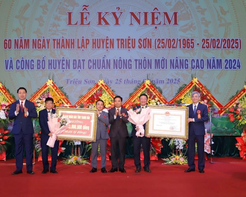 Tại buổi lễ, thừa ủy quyền của Thủ tướng Chính phủ, đồng chí Bí thư Tỉnh ủy Nguyễn Doãn Anh đã trao Bằng công nhận huyện Triệu Sơn đạt chuẩn NTM nâng cao năm 2024 của Thủ tướng Chính phủ cho huyện Triệu Sơn; đồng chí Đỗ Minh Tuấn, Phó Bí thư Tỉnh ủy, Chủ tịch UBND tỉnh trao Cờ thi đua của Chính phủ cho huyện Triệu Sơn; đồng chí Nguyễn Doãn Anh Bí thư Tỉnh ủy và đồng chí Đỗ Minh Tuấn, Phó Bí thư Tỉnh ủy, Chủ tịch UBND tỉnh đã trao bức trướng của Ban Chấp hành Đảng bộ tỉnh cho huyện Triệu Sơn.