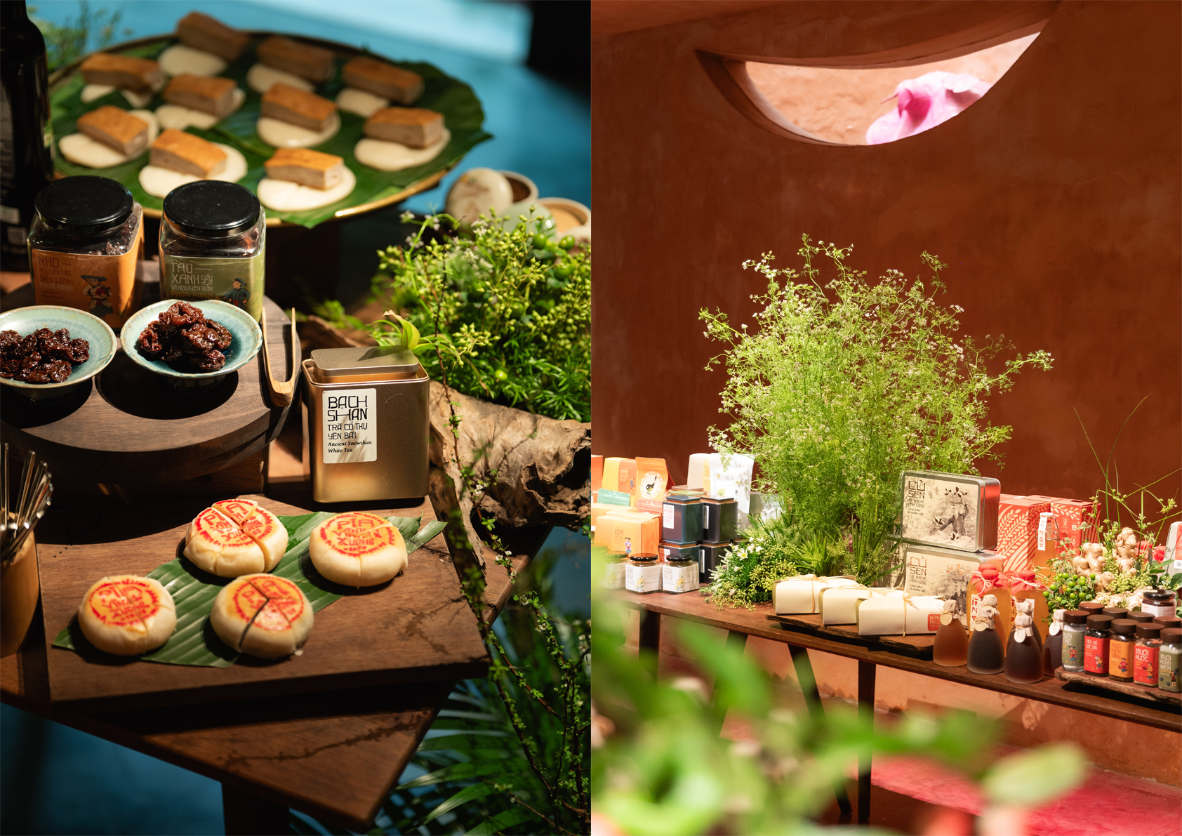 Bộ quà không thiếu những thức dùng ngày Tết đậm vị truyền thống với trà thơm – rượu quý, trà Shan Tuyết cổ thụ, các dòng rượu địa phương (rượu sen bách hoa Đồng Tháp, rượu nếp Bến Tre...) và cũng không kém phần tươi mới với bộ sưu tập sô-cô-la bản địa phối quyện gia vị nhiều vùng miền. Mâm cỗ Tết trong quà tặng The Bloom giữ vững chất lượng mâm Tết đặc sản với đủ vị Bánh chưng thịt lợn thảo mộc, Củ kiệu Huế, Tôm khô sinh thái Cà Mau cùng nhiều đặc sản khẩu vị khó tìm khác...