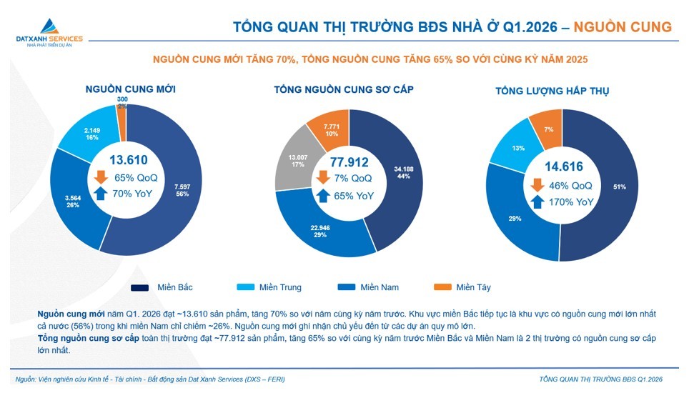 Theo DXS-FERI, nguồn cung mới trong quý 1/2026 ước đạt khoảng 13.600 sản phẩm, tăng 70% so với cùng kỳ năm trước nhưng giảm tới 65% so với quý 4/2025. Tổng nguồn cung sơ cấp toàn thị trường đạt khoảng 78.000 sản phẩm, tăng 65% theo năm nhưng giảm 7% theo quý .
