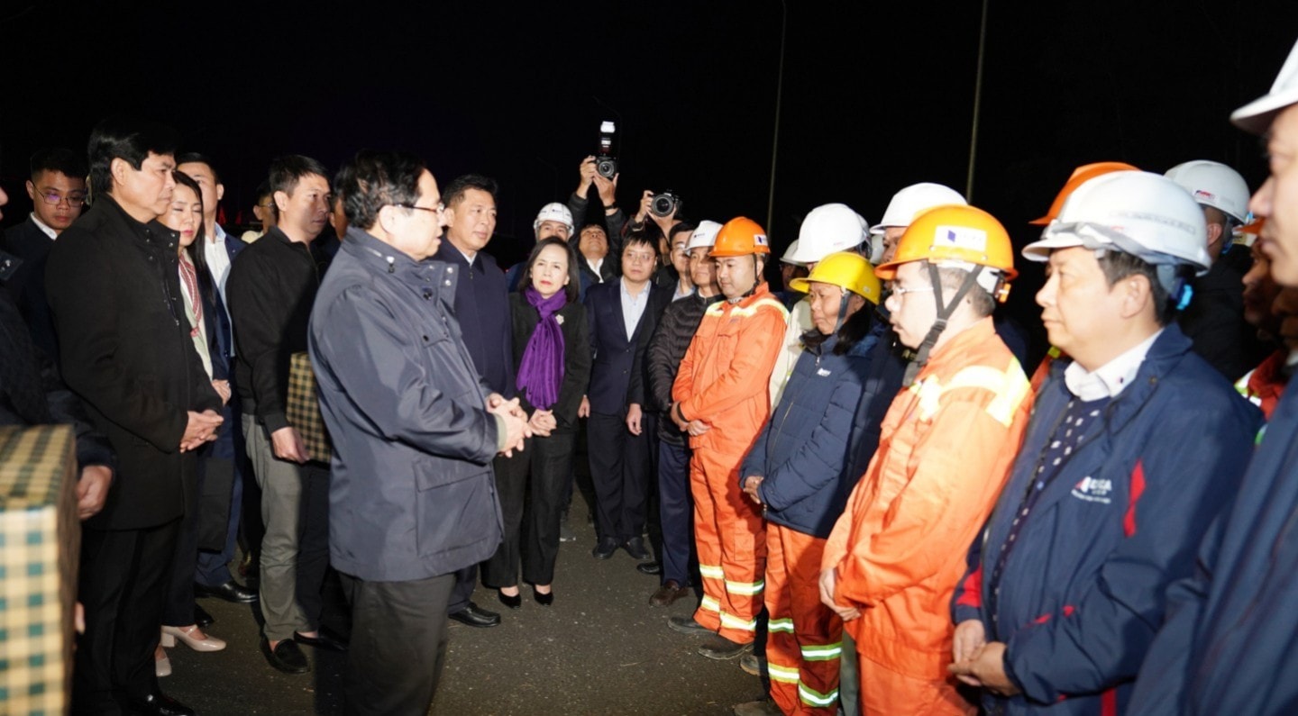 Thủ tướng ghi nhận, biểu dương tinh thần làm việc không nghỉ Tết của đội ngũ thi công với phương châm “3 ca 4 kíp”, “vượt nắng thắng mưa”, “xuyên lễ Tết, xuyên ngày nghỉ” nhằm bảo đảm tiến độ dự án.