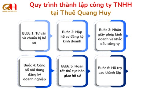 Thuế Quang Huy xây dựng quy trình chuyên nghiệp, linh hoạt và tối ưu, giúp khách hàng hoàn tất thủ tục thành lập công ty TNHH một cách nhanh chóng, tiết kiệm thời gian và chi phí. Dưới đây là các bước triển khai dịch vụ: