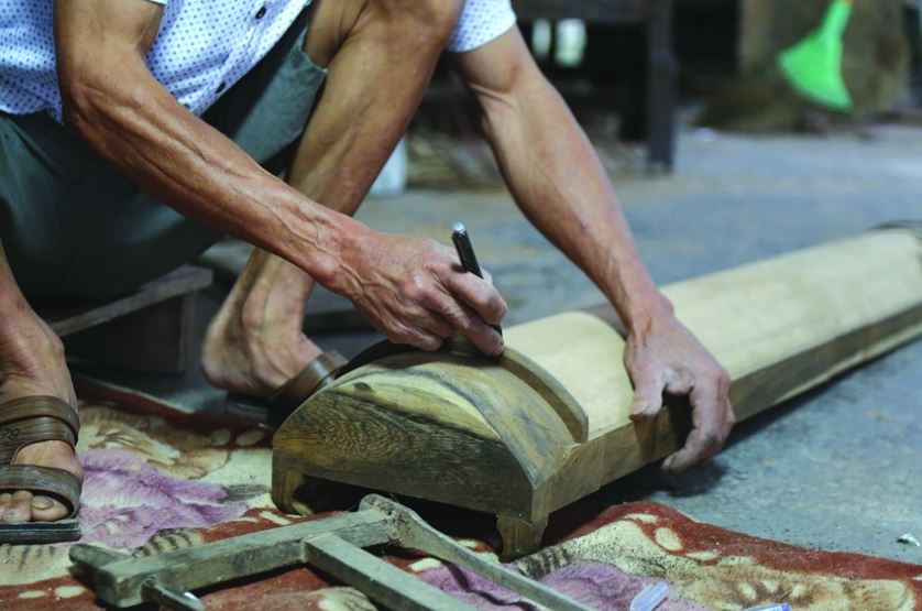 Ngoài gỗ, một số loại đàn còn cần sử dụng da trăn để chế tác, và những người thợ phải rất tỉ mỉ trong từng công đoạn. Từ việc vào khuôn, ghép cần, làm phím, lên dây cho đến khâu cuối cùng là trang trí họa tiết, hoa văn, tất cả đều được thực hiện thủ công một cách cẩn thận. Đặc biệt, công đoạn căng dây và gắn phím là một trong những bước quan trọng nhất, quyết định âm thanh của đàn.