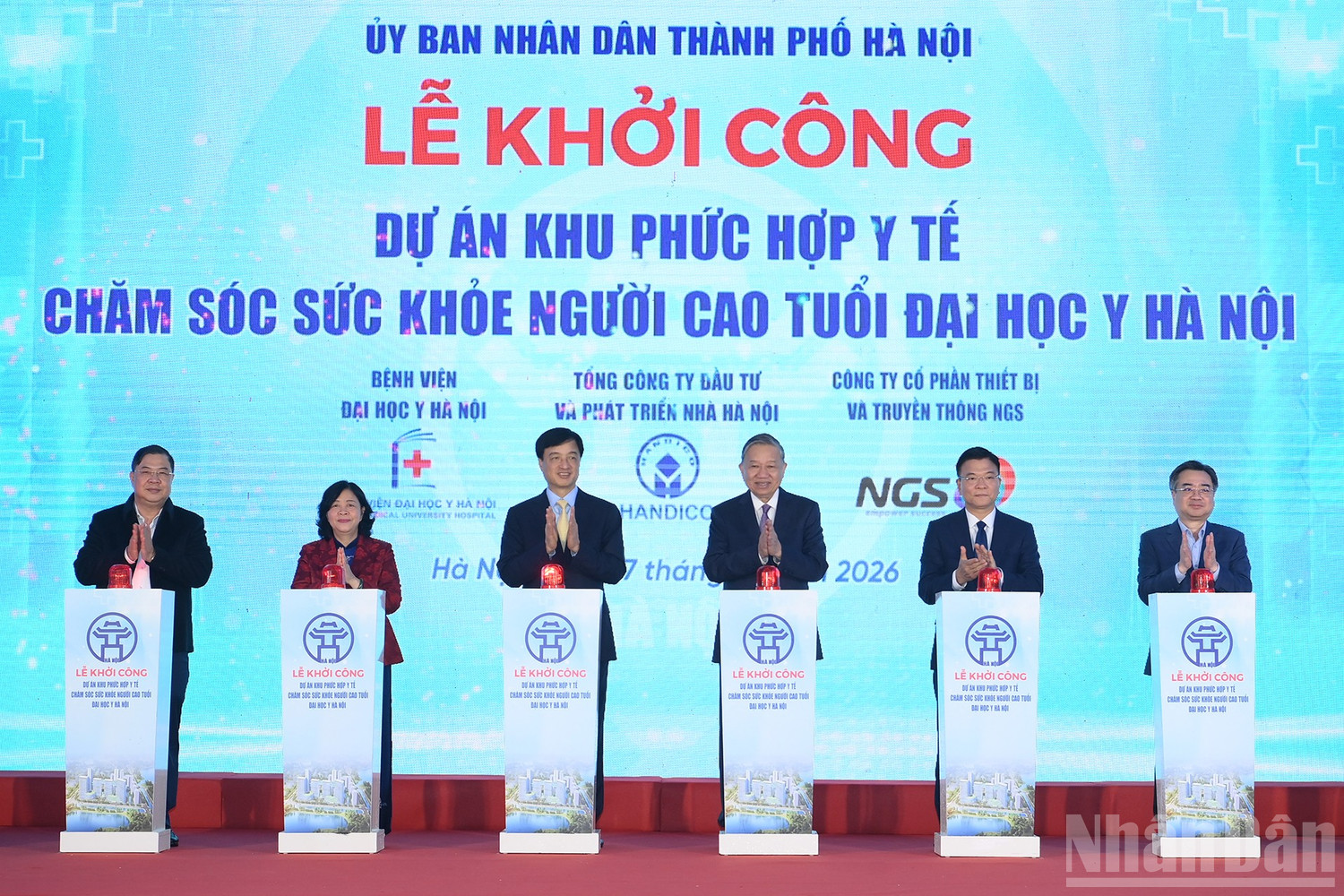 Tổng Bí thư Tô Lâm và các đại biểu thực hiện nghi thức khởi công xây dựng Khu phức hợp y tế - Chăm sóc sức khỏe người cao tuổi Đại học Y Hà Nội. Ảnh Nhân Dân