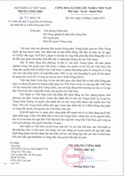 Ngày 5/5, Hội Nghề cá Việt Nam thông tin đã gửi công văn đến Văn phòng Chính phủ, Bộ Nông nghiệp và phát triển nông thôn, Ban Đối ngoại Trung ương về việc phản đối phía Trung Quốc đơn phương cấm đánh bắt cá trên Biển Đông năm 2021.