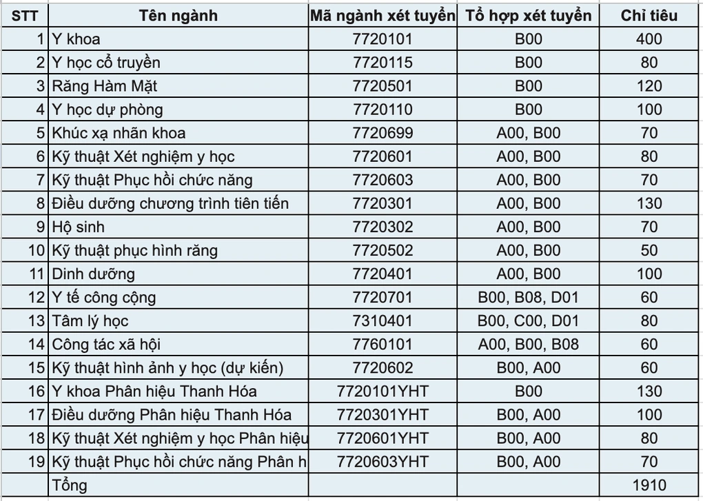 Chỉ tiêu và tổ hợp xét tuyển 19 ngành Trường Đại học Y Hà Nội. Bảng biểu: Hoàng Hồng