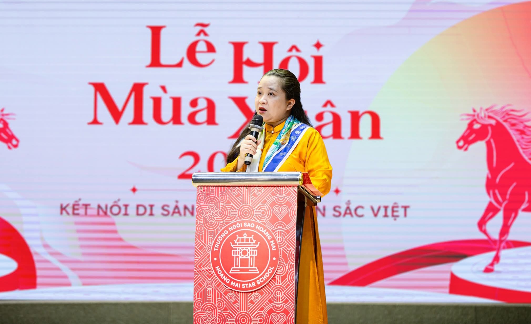 Phát biểu tại lễ khai mạc, cô Nguyễn Thị Vân Trang - Giám đốc điều hành Trường Ngôi Sao Hoàng Mai – nhấn mạnh: Lễ hội Mùa Xuân không chỉ là dịp để học sinh trải nghiệm, khám phá và thêm tự hào về các giá trị mà di sản để lại, mà còn là cơ hội để các em rèn luyện tinh thần trách nhiệm, sự sẻ chia và lòng nhân ái thông qua những hoạt động thiện nguyện ý nghĩa. Nhân dịp này, cô cũng gửi lời tri ân tới quý cha mẹ, đối tác, thầy cô và các con học sinh đã cùng chung tay tạo nên một ngày hội giàu giá trị, lan tỏa tinh thần “Xây những nhịp cầu yêu thương” của cộng đồng Ngôi Sao Hoàng Mai.