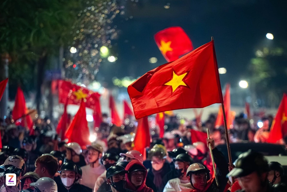 3h sáng 21/1, không khí tại hầm chui Kim Liên vẫn không có dấu hiệu hạ nhiệt. Cổ động viên đi "bão" nhuộm đỏ cả cung đường bằng lá cờ đỏ sao vàng.