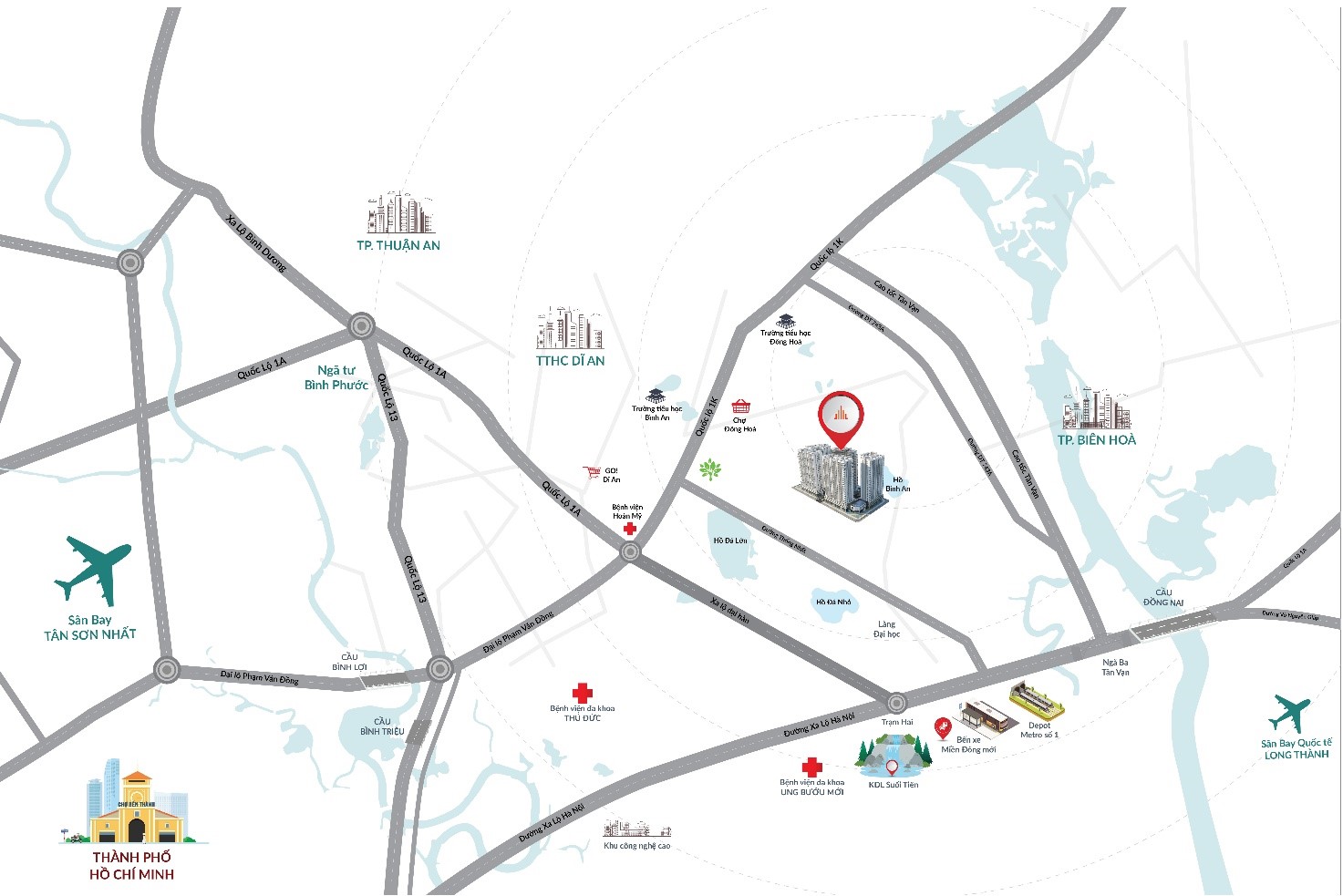 Từ vị trí của khu căn hộ, cư dân có thể dễ dàng di chuyển đến tuyến metro, bến xe miền Đông mới hay đi sân bay quốc tế Long Thành chỉ trong 1 tuyến đường duy nhất và dễ dàng tiếp cận với làng đại học cùng các tiện ích nổi bật xung quanh khác.