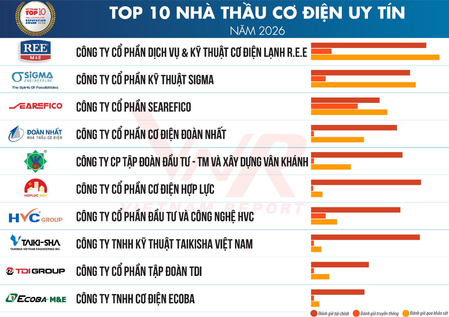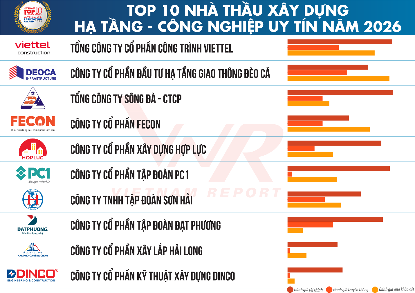 Bên cạnh Top 10 nhà thầu xây dựng uy tín ngành xây dựng, Vietnam Report cũng công bố Top 10 nhà thầu xây dựng hạ tầng - công nghiệp uy tín năm 2026; Top 10 nhà thầu cơ điện uy tín năm 2026; Top 5 công ty tư vấn thiết kế hạ tầng uy tín năm 2026.