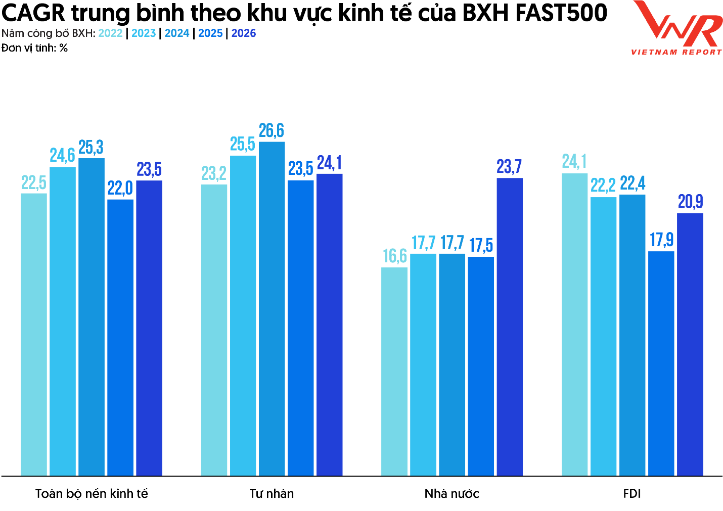 Theo thống kê từ Bảng xếp hạng FAST500 năm 2026, tốc độ tăng trưởng kép bình quân hàng năm (CAGR) về doanh thu của các doanh nghiệp giai đoạn 2021-2024 đạt mức 23,5%. Đây là dấu hiệu phục hồi tích cực sau giai đoạn thị trường chịu nhiều sức ép từ biến động kinh tế toàn cầu.