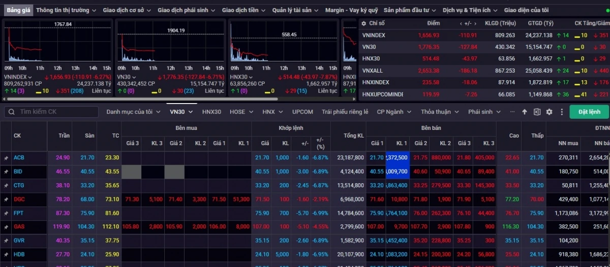 Áp lực bán dứt khoát khiến bảng điện tử ngập trong sắc xanh lơ, tạo ra một khoảng trống giảm giá (gap down) rất lớn – tín hiệu của trạng thái bán tháo mang tính hoảng loạn.