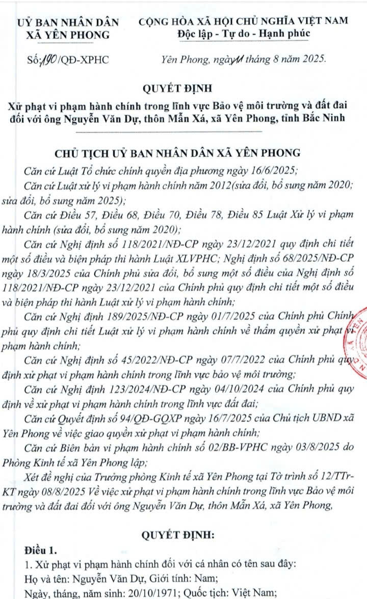 Ngày 11/8/2025, UBND xã Yên Phong đã ban hành văn bản số 190/QĐ-XPHC Quyết định xử phạt vi phạm hành chính trong lĩnh vực bảo vệ môi trường và đất đai đối với ông Nguyễn Văn Dự, SN 1971 tại thôn Mẫn Xá, xã Yên Phong, tỉnh Bắc Ninh (cá nhân vi phạm -PV).