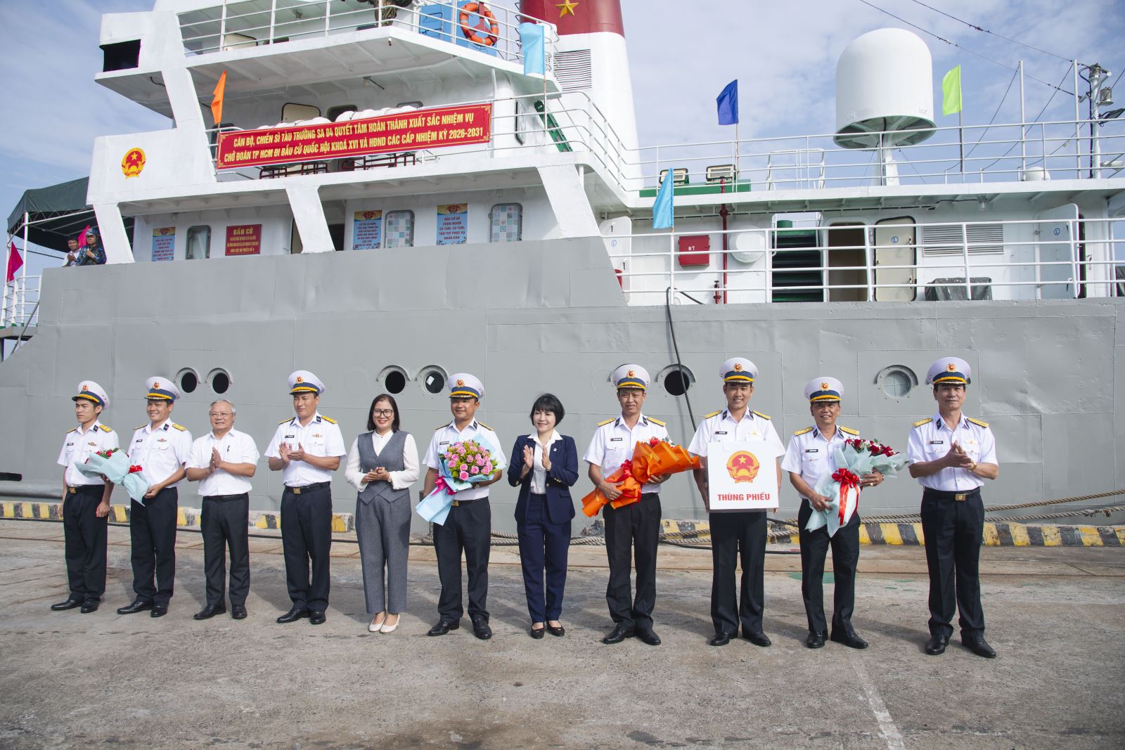 Sáng 12/3, Bộ Tư lệnh Vùng 2 Hải quân phối hợp với Ủy ban Bầu cử xã Long Sơn, TP Hồ Chí Minh tổ chức đón tổ bầu cử sớm trên biển trở về đất liền sau 15 ngày thực hiện nhiệm vụ đưa thùng phiếu đến với cử tri trên các nhà giàn DK1, tàu trực và ngư dân đang khai thác hải sản trên thềm lục địa phía nam của Tổ quốc.