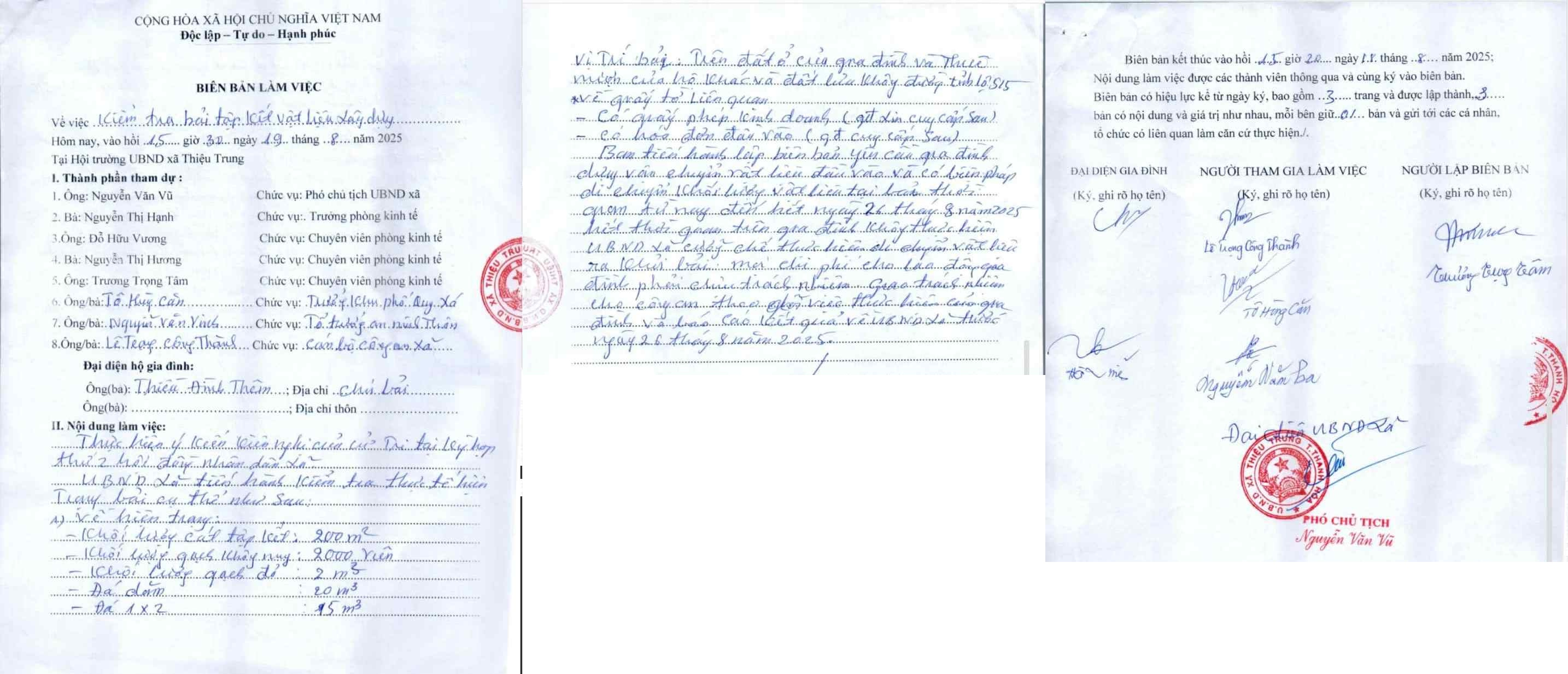 Trước thực trạng bãi tập kết cát của gia đình Thêm Toàn hoạt động trái phép suốt thời gian qua, ngày 19/8/2025, UBND xã Thiệu Trung đã có biên bản kiểm tra bãi tập kết vật liệu xây dựng của gia đình ông Thiều Đình Thêm, chủ bãi cát.
